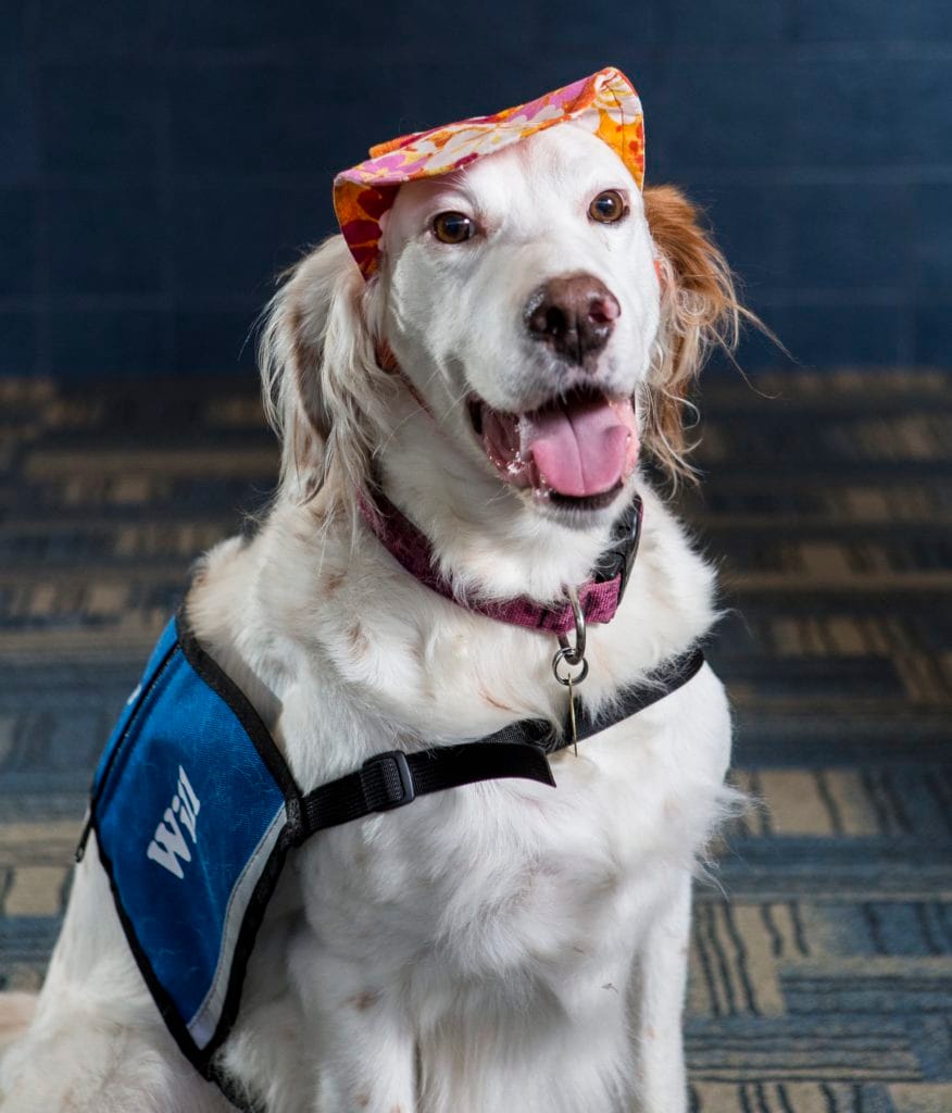 Will, a mischievous but loving English Setter, was found in 2011 on an airplane tarmac in Tennessee with another English Setter, his beloved Kate. He became a therapy dog soon after and is always so excited when he sees his vest – because he knows he is going on a visit! Besides cuddling, he loves